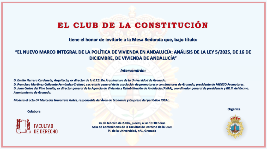 Por circunstancia sobrevenidas, ajenas al Club, comunicamos que se traslada el acto de la Mesa Redonda sobre la Ley de Vivienda de Andalucía, a celebrar el próximo día 26 de los corrientes, a las 19:30 horas, a la SALA DE CONFERENCIAS DE LA FACULTAD DE DERECHO DE LA UNIVERSIDAD DE GRANADA. Rogamos disculpen las molestias.